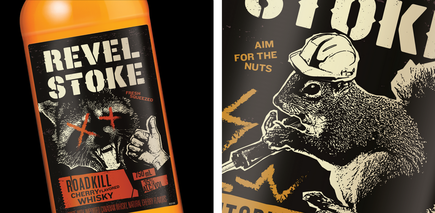 Run Wild and Drink Free. Revel Stoke offers an alternative to the snobbery and connoisseurship of the whisky category with a bold personality and a wild attitude. Each flavor expression sports collaged illustrations and brash commentary in a "punk zine meets whisky bar" approach.